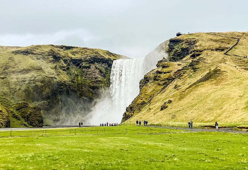 Derefter besøger vi det imponerende Skogafoss-vandfald, kendt fra filmene "Thor" og "Walter Mitty". Dette kraftfulde vandfald, der falder fra en højde på 60 meter, er et spektakulært syn, og hvis vi er heldige, kan vi endda se en regnbue i vandets tåge.