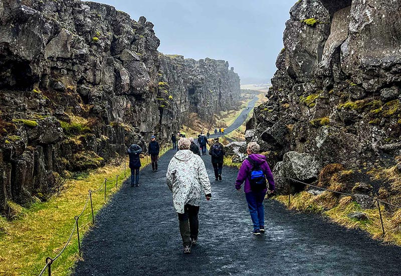 I dag rider vi gennem Thingvellir National Park og følger naturskønne stier gennem skove og lavabildninger. Vi passerer de forladte gårde Hrauntún og Skógarkot, inden vi når bredden af søen Thingvallavatn, Islands største naturlige sø. Stien fortsætter gennem et fascinerende landskab med store revner skabt af bevægelserne i de kontinentale plader. Fra Gjábakki-gården har vi en enestående udsigt over den store dal mellem de amerikanske og eurasiske kontinentale plader, søen Thingvallavatn og de vulkanske bjerge, der omgiver søen. Dette område er en stor dal formet af is fra gletsjere og mange vulkanudbrud. Vi fortsætter langs en gammel sti til bjergskuret Kringlumýri, hvor vi afslutter turen.