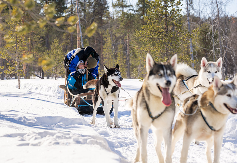 Husky-safari (ca. 2,5 timer) Efter udlevering af udstyr møder du huskyerne. Du får instruks i at køre slæden, inden du glider ud gennem frosne søer og skove. To personer deler et team og bytter halvvejs.