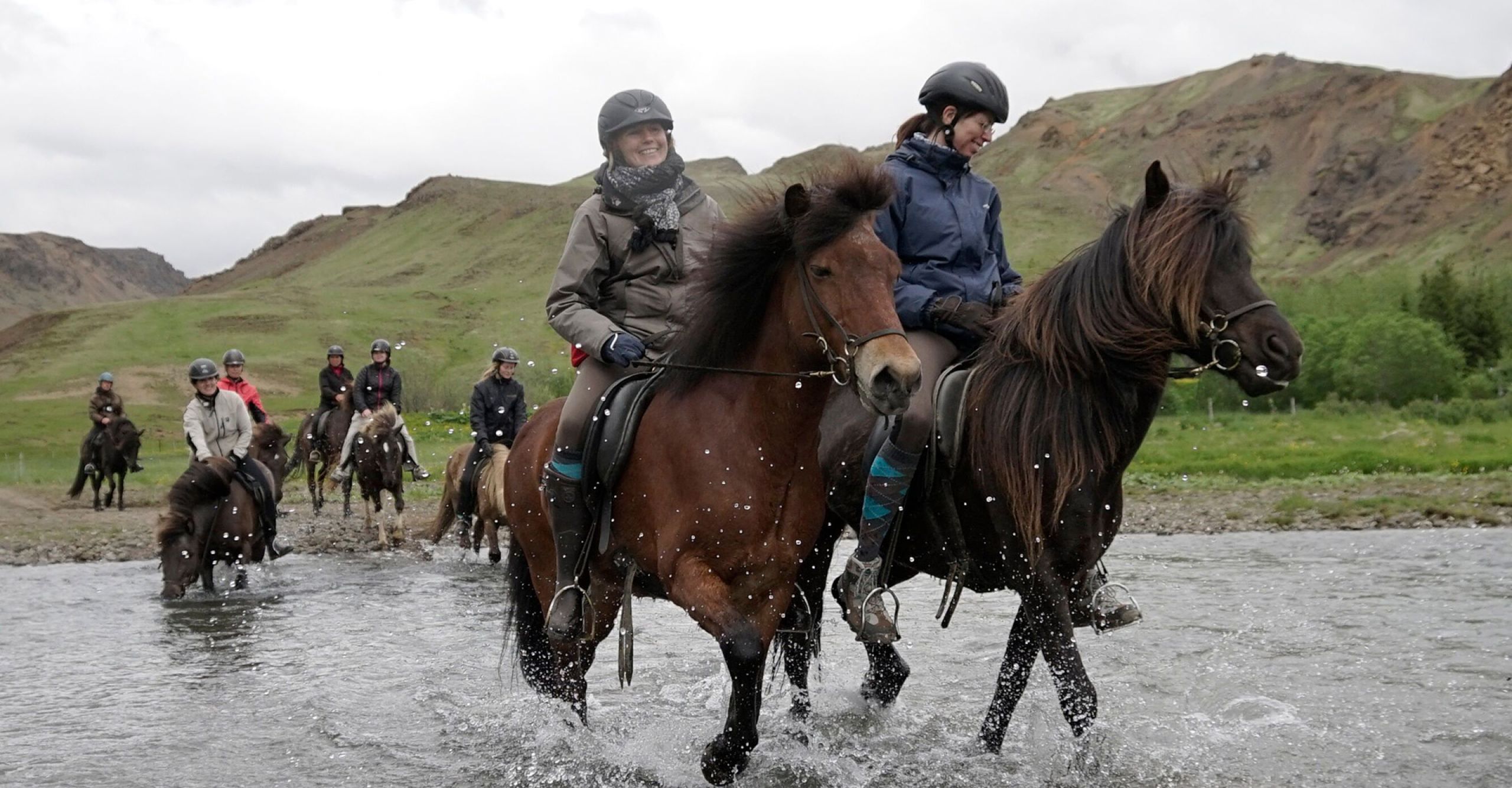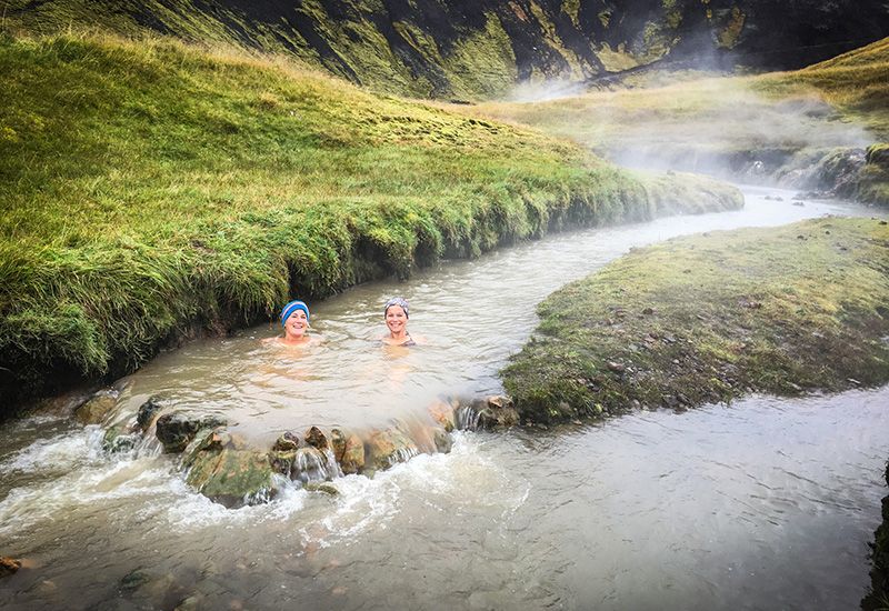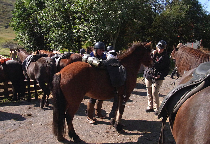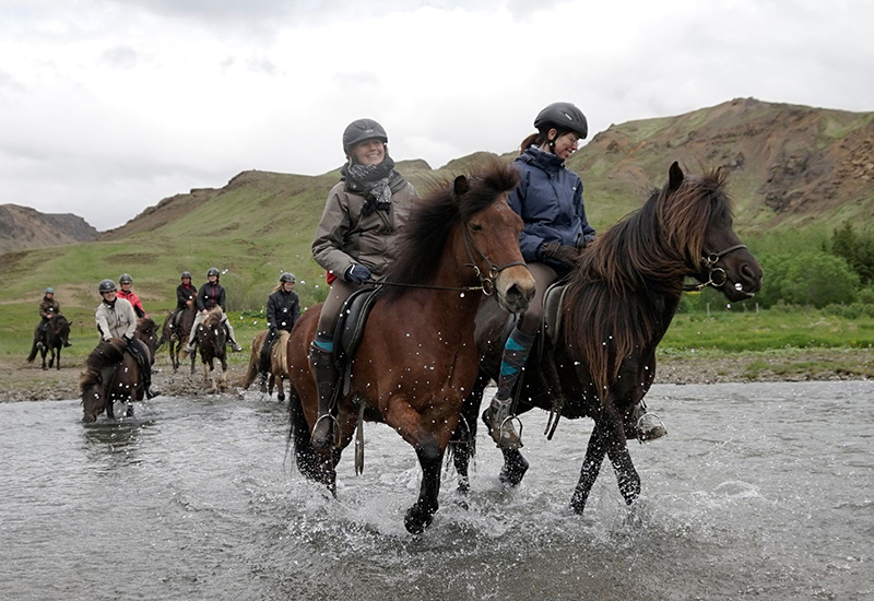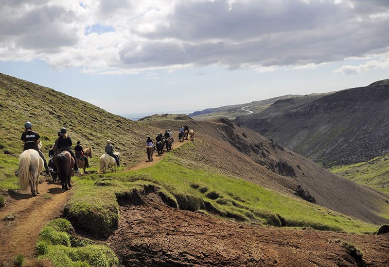 Vi rider først langs skråningerne af Reykjafjall-bjerget og forsætter omkring den lille landsby Hveragerði. Stien fører os derefter gennem en grøn skov til en farverig geotermisk dal med varme kilder, et område som udvidede sig dramatisk under et jordskælv i 2008. På vores vej mod de grønne bakker omkring bakker omkring vulkanen Hengill har vi god mulighed for at prøve ’tölt’, den islandske hests særlige gangart. Hestene tager os derefter på et roligt tempo efter smalle stier op i Reykjadalur dalen. Vi passerer det smukke vandfald Djúpagilsfoss og nogle varme kilder, inden vi når Reykjadalur dalen og får mulighed for at tage et afslappende bad i en varm kilde. Under turen ned i dalen nyder vi fascinerende udsigt over omgivelserne, landsbyen Hveragerði, landbrugsjord og helt ned til kysten, hvor vi kan se Vestmanøerne, hvis vejret tillader det. Vi forsætter langs bjergsrkåningerne igen tilbage til vores gård Vellir, hvor turen slutter. Efter nogle forfriskninger kører bussen os tilbage til Reykjavik omrking kl 16:30.